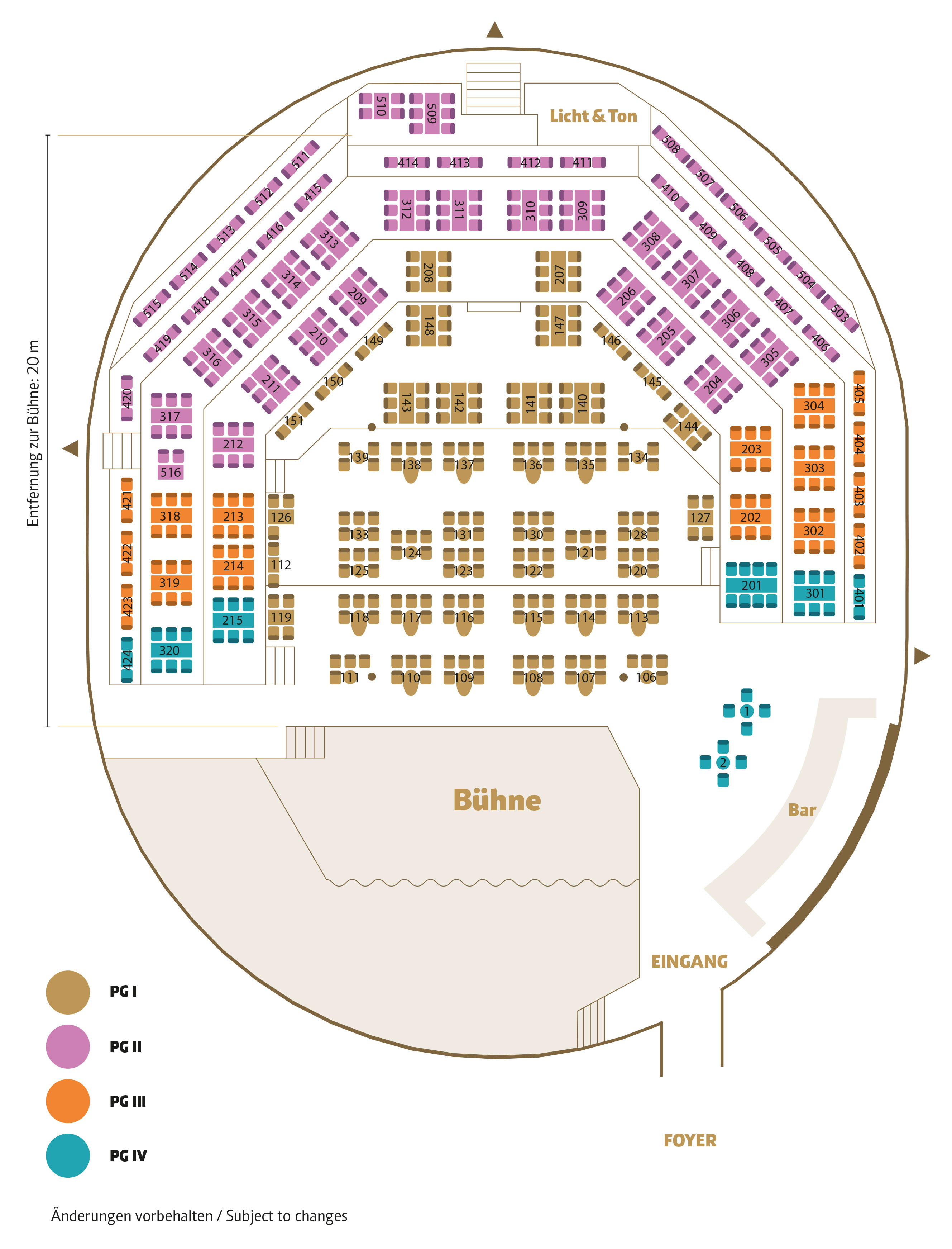 Die Theaterkasse und das Foyer sind barrierefrei zugänglich. Im Saal können Sie in der Preisgruppe I (PG I) bis zur fünften Tischreihe (Tische 106 - 139) barrierefrei sitzen.